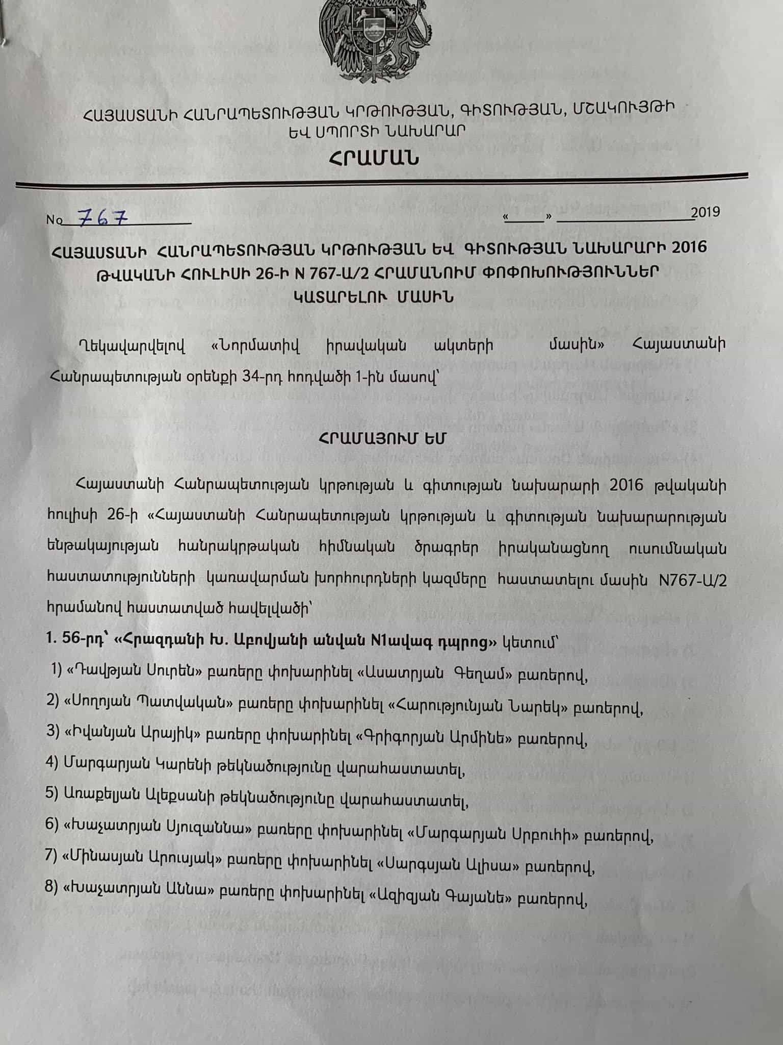 Հոդվածում մասնավորապես ասվում է. «2020թ. հունվարի 22-ին Աբովյան քաղաքի Խ. Աբովյանի անվան թիվ 1 ավագ դպրոցում տեղի ունեցան գործադիր տնօրենի ընտրություններ: Թեկնածուները երկուսն էին՝ գործող տնօրեն Մետաքսյա Բաբայանը և նույն քաղաքի թիվ 10 հիմնական դպրոցի ուսուցչուհի Քարմիլե Առաքելյանը: Հանրակրթական դպրոցի տնօրենին ընտրում է կառավարման խորհուրդը, որը բաղկացած է 8 անդամից՝ 2-ը մանկավարժական կոլեկտիվի ներկայացուցիչներ, 2-ը՝ ծնողական խորհրդի, ավագ դպրոցների պարագայում 3-ը՝ ԿԳՄՍ ներկայացուցիչներ և մեկը՝ մարզպետարանից: Հիմնական դպրոցների դեպքում մանկավարժական և ծնողական խորհուրդների ներկայացուցիչների թիվը նույնն է, սակայն, ի տարբերություն ավագ դպրոցի, մյուս 4-ից երեքը արդեն ներկայացնում են մարզպետարանը, իսկ մեկը՝ համայնքը: Խ. Աբովյանի անվան թիվ 1 ավագ դպրոցի տնօրենի ընտրությունների ժամանակ խորհուրդի ձայները բաշխվեցին հավասար՝ 4/4: Այս դեպքում, ըստ գործող կարգի, վերջնական որոշումը կայացնում է նախարարը: