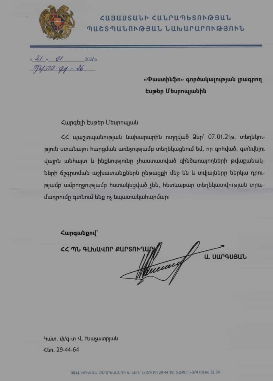 «Տեղեկացնում ենք, որ զոհված, գտնվելու վայրն անհայտ և ինքնությունը չհաստատված զինծառայողների թվաքանակների ճշգրտման աշխատանքներն ընթացքի մեջ են և տվյալները ներկա դրությամբ ամբողջությամբ հստակեցված չեն, հետևաբար տեղեկատվության տրամադրումը գտնում ենք ոչ նպատակահարմար»,- նշված 21.01.2021թ. պատասխանի մեջ։