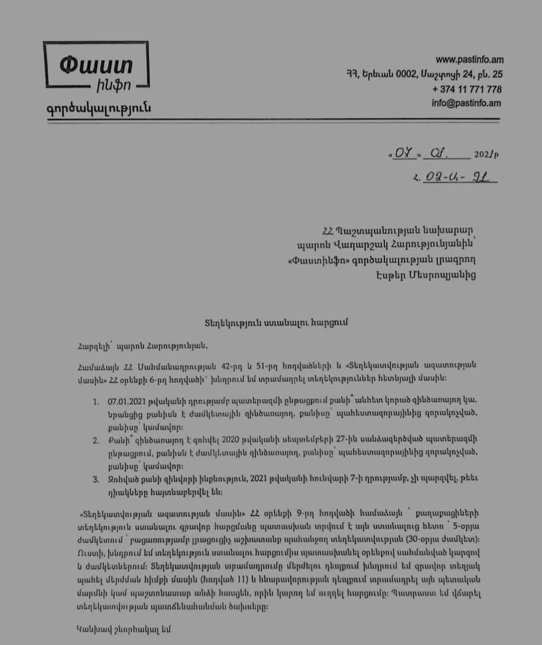 Ինչպես արդեն տեղեկացրել ենք՝ հարցումն ուղարկել էինք դեռևս հունվարի 7-ին խնդրելով հայտնել, թե արցախյան երրորդ պատերազմում քանի զինվոր է նահատակվել, նրանցից քանի՞սն են ժամկետային զինծառայող, քանի՞սը՝ պահեստազորային, քանի՞սը՝ կամավոր։ Նույն տվյալներն ակնկալում էինք ստանալ նաեւ անհետ կորածների վերաբերյալ, եւ թե քանի՞ հայտնաբերված աճյունի ինքնություն չի պարզվել։