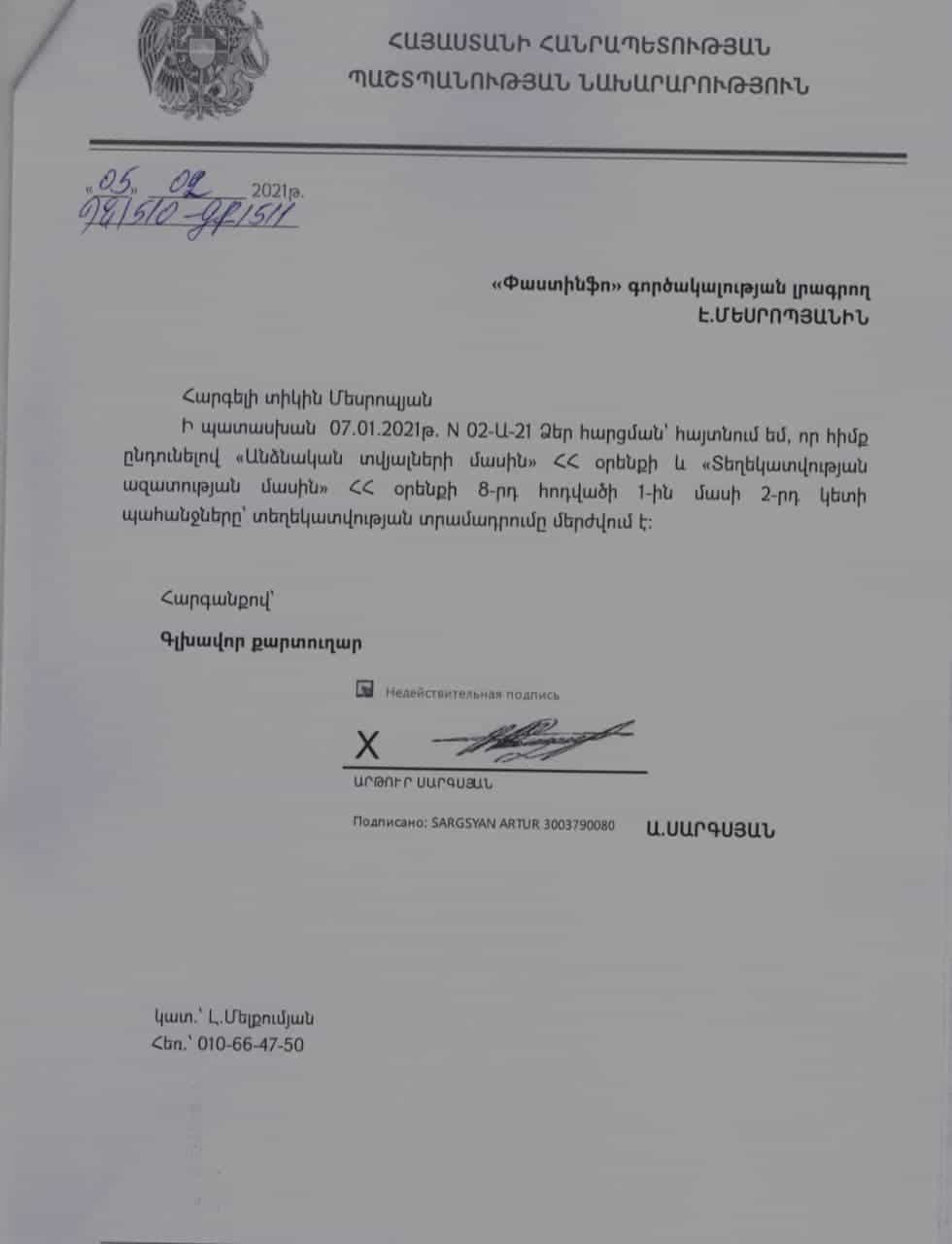«Հայտնում ենք, որ հիմք ընդունելով «Անձնական տվյալների մասին» ՀՀ օրենքի և «Տեղեկատվության ազատության մասին» ՀՀ օրենքի 8-րդ հոդվածի 1-ին մասի 2-րդ կետի պահանջները՝ տեղեկատվության տրամադրումը մերժվում է»,- գրված է ՊՆ-ի պատասխանում։