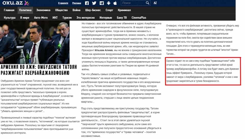 Ադրբեջանական լրատվամիջոցներից մեկը հրապարակել է հերթական նյութը ՀՀ մարդու իրավունքների պաշտպանի մասին՝ ատելություն հրահրելու հաշվին անելով քաղաքական եզրահանգումներ, օրինակ` «Քանի որ երկիրը, որի ապագան կախված է Ադրբեջանի հետ խաղաղություն հաստատելուց, «Թաթոյանների» ու նրա համակիրների ջանքերով շարունակում է ամրապնդվել հուսահատության փակուղում»։