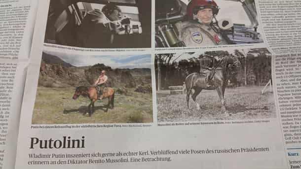Շվեյցարական Tages-Anzeiger թերթը ՌԴ նախագահ Վլադիմիր Պուտինին համեմատել է իտալացի բռնապետ Բենիտո Մուսոլինիի հետ: ԶԼՄ-ները գտել են լուսանկարներ, որոնցում Պուտինը և Մուսոլինին հանդես են գալիս մերկ իրանով, ինչպես նաև ձի հեծնում, դահուկ քշում կամ լողում լճում:
