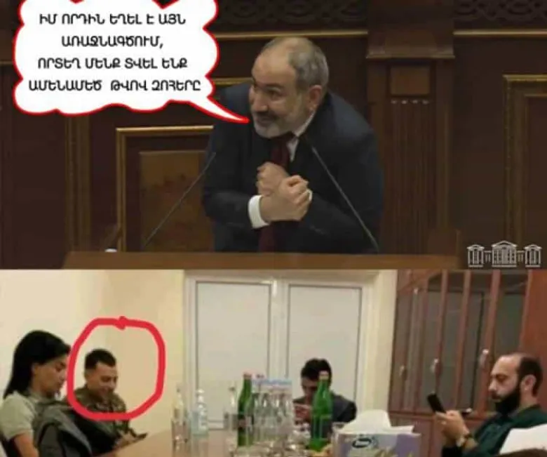 Ասում է՝ «Լավ, երկրի առաջին դեմքը ո՞նց կարա սենց սուտ ասի, մենք էլ հո ստեղ ենք, չենք մեռել», ու մի պատմություն պատմեց. «Ուրեմն, մեր կամավորներին, որ առաջին գիծ են տանելուց եղել, խորը թիկունքում մի տեղ շենք է եղել, որի կողքով են անցել ու տեսել են՝ մեր սիրելի վարչապետի տղան՝ մի ջոկատ թիկնապահներով, էդ շենքի դեմը նստած պեչենի է ուտում: Էս մարդիկ մի քանի անգամ անցել են էդ շինության կողքով, ինչքան անցել են, էնքան աժդահակ Աշոտիկը էդտեղ նստած է եղել։