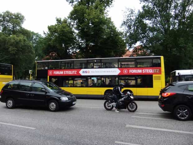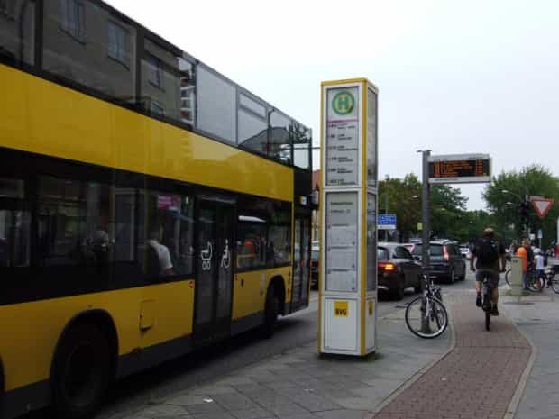 Բեռլինյան ավտոբուսները 3-դռնանի են, եւ չափերով երեւանյաններից նկատելիորեն մեծ են: Մեջտեղի դուռը բավականին լայն է եւ հարմար է սայլակների համար՝ ինչպես հաշմասայլակների, այնպես էլ մանկասայլակների: Անհրաժեշտության դեպքում, երբ ավտոբուսի աստիճանի եւ մայթեզրի միջեւ տարբերությունը սայլակի համար մեծ է, վարորդն իջնում է եւ դռան վրա տեղադրում շարժական հարթակ: Այս դռան առջեւ սրահում ընդարձակ ազատ հարթակ է՝ սայլակներով ուղեւորների համար: Բեռլինում հաճախ են հանդիպում երկհարկ ավտոբուսներ, այդ թվում՝ քաղաքում տուրիստական ուղեւորությունների համար: