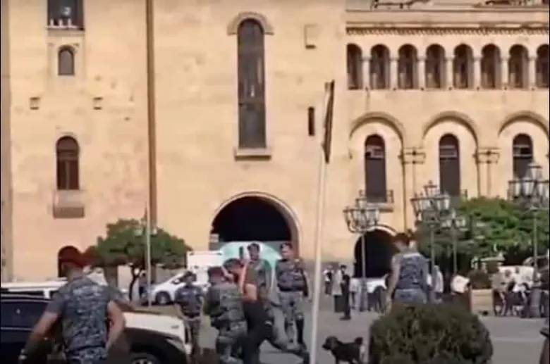 Մի խումբ ոստիկաններ ձեռքերը ծալելով բերման են ենթարկում քաղաքացու, ով բղավում էր «Նիկոլ, հեռացիր» (տեսանյութ)