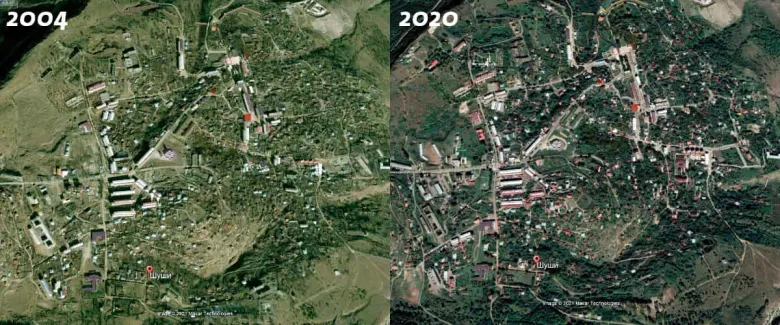 Նկարում Շուշին ա 2004 ու 2020 թվականին։ 2020 թվականի նկարը մինչպատերազմական շրջանի է։ Նայեք շենք-շինություններին ու ասեք՝ իրո՞ք նախկինները Շուշին համարել են ադրբեջանական ու ոչ մի բան չեն կառուցել, թե՞ Լիտվայի համբալներն ու Շուշին հանձնողը հերթական մանիպուլյացիան են անում։
