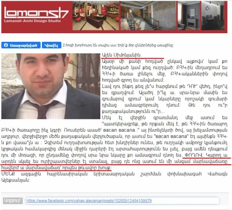ՀՅԴ անդամ, տնտեսագետ Արմեն Գրիգորյանի գրառումը. «Վահագն Ալեքսանյանն ասում է Ալենին, որ ընդմիշտ մարմնավաճառ եմ ասել, դա ասել եմ 18-19 տարեկանում: