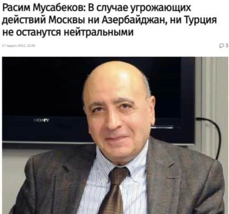Եթե Ռուսաստանը սկսի սպառնալից գործողություններ Ադրբեջանի նկատմամբ, ապա Թուրքիան չեզոք դիրք չի գրավի։ Այս հայտարարության հեղինակը Ադրբեջանի խորհրդարանի պատգամավոր Ռասիմ Մուսաբեկովն է, որը հարցազրույց է տվել տեղական «Մինվալ» կայքին։
