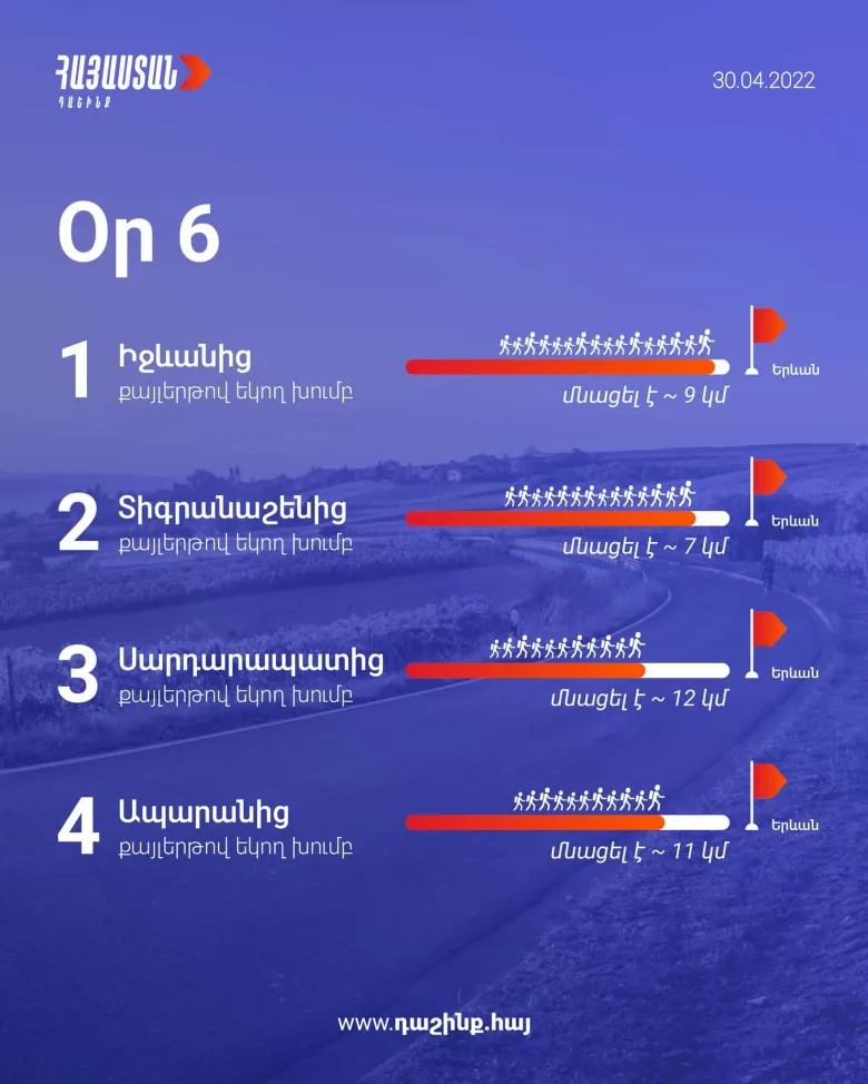 Իջևանից և Ապարանից մեկնարկած քայլերթերի մասնակիցները հասել են Երևանի դարպասներին։ Մյուս խումբն իր քայլերթն սկսել է Արարատի մարզի Տիգրանաշեն բնակավայրից և այսօրվա երեկոն ամփոփել է Այնթափում։ Դիմադրության ճանապարհը բռնած մեկ այլ խումբ գալիս է Սարդարապատից և օրվա տպավորություններով կիսվել է խարույկի մոտ, Փարաքարում»։