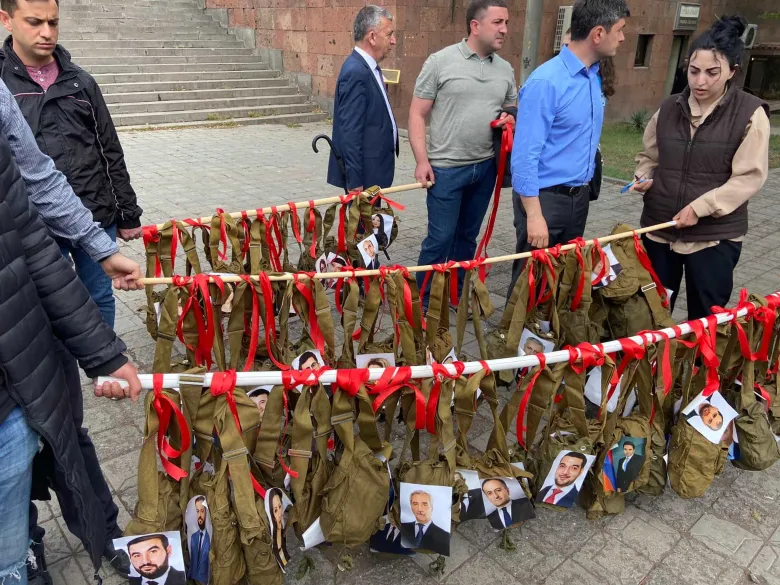 Ակցիայի մասնակիցները բերել են ուսապարկեր, որոնց վրա ամրացված են ՔՊ-ական պատգամավորների լուսանկարները։ Մասնակիցներն ուսապարկերը նետեցին գետնին։