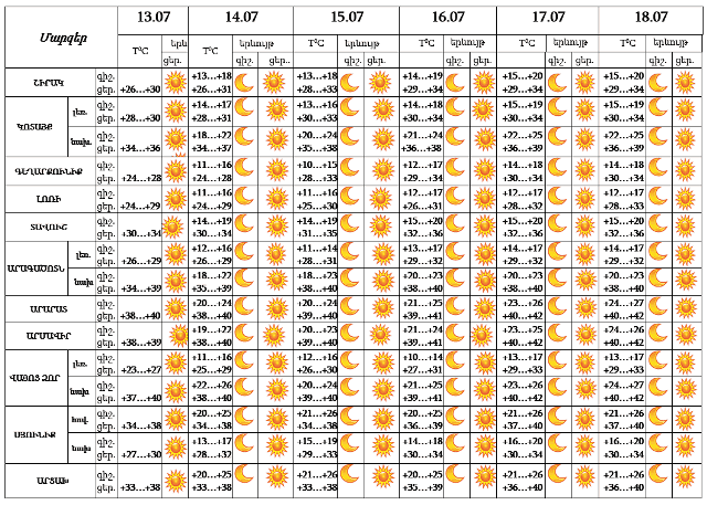 Հուլիսի 13-18-ի ցերեկային ժամերին օդի ջերմաստիճանը կհասնի +39…+42 աստիճանի