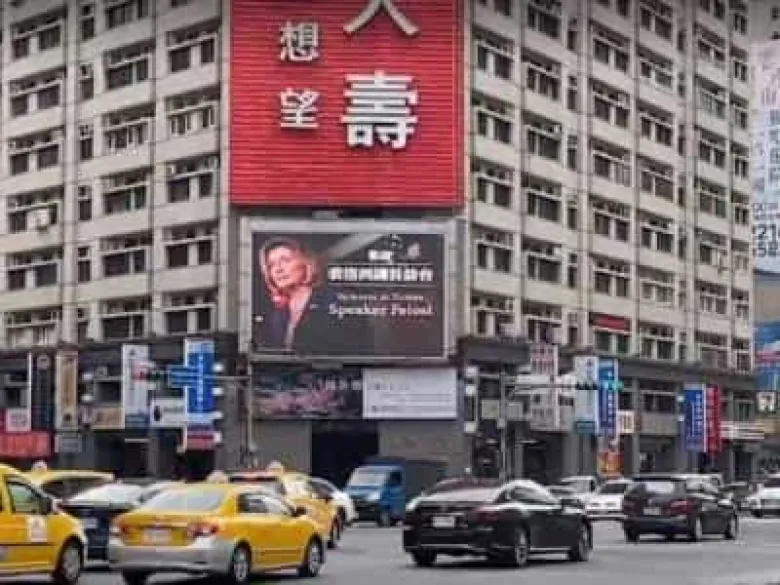 Թայբեյի կենտրոնում հսկայական պաստառ է հայտնվել՝ «Բարի գալուստ Թայվան, խոսնակ Փելոսի», չինարեն եւ անգլերեն լեզուներով։