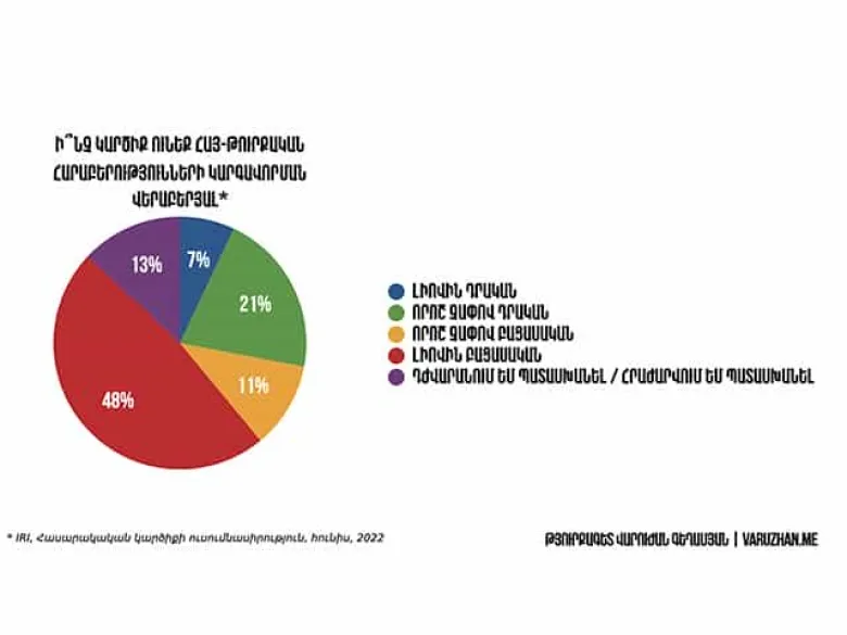 «Ի՞նչ կարծիք ունեք հայ-թուրքական հարաբերությունների կարգավորման վերաբերյալ» հարցին մեր երկրի բնակչության մեծամասնությունը՝ (շուրջ 60%-ը) պատասխանել է, որ ունի բացասական կարծիք, այսինքն՝ դեմ է այդ փաստացի կապիտուլիացիոն գործընթացին։ Միանշանակ դրական է տրամադրված ընդամենը 7%-ը, որն էլ իր հերթին հետևողական քարոզի արդյունք է, որ վարվում է օրնիբուն պետական և իշխանական ռեսուրսներով։