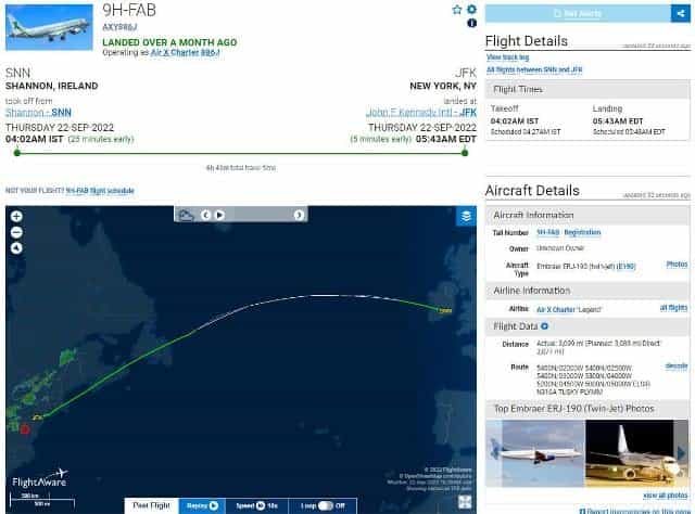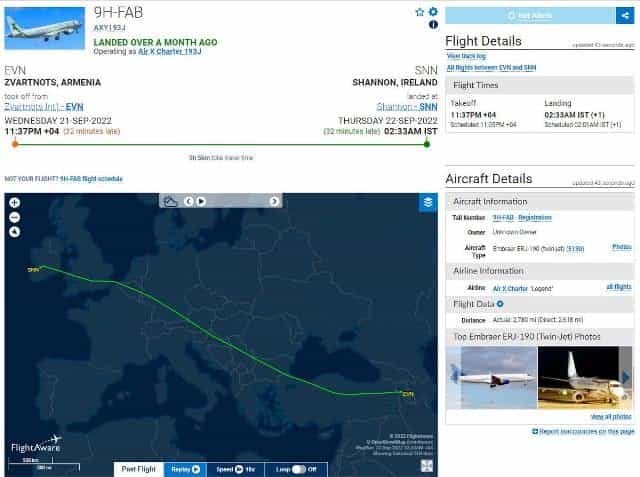 Սեպտեմբերի 21-ի գիշերը «Զվարթնոց» ժամանելուց մոտ 1,5 ժամ անց 9H-FAB-ը Երեւանից թռել է իռլանդական «Շանոն» օդանավակայան: