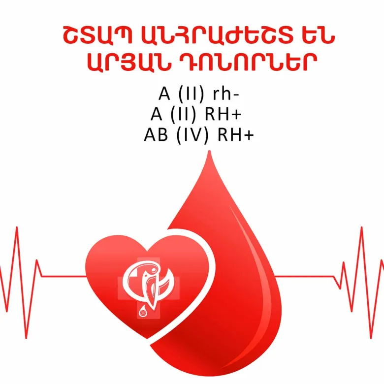 Կենտրոնը խնդրում է A (II) rh- (երկրորդ բացասական), (II) RH+ (երկրորդ դրական), AB (IV) RH+ (չորրորդ դրական) արյան նշված կարգերն ունեցող անձանց մոտենալ Արյունաբանական կենտրոնի Արյան բանկ: