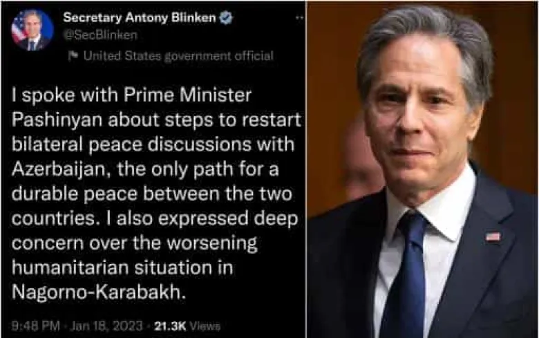 ԱՄՆ պետքարտուղար Էնթոնի Բլինքենը ՀՀ վարչապետ Նիկոլ Փաշինյանի հետ հեռախոսազրույցից հետո գրառում է արել իր թվիթերյան միկրոբլոգում.