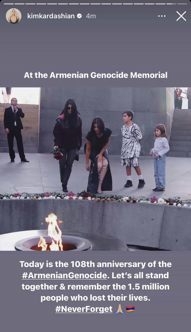 Քիմ Քարդաշյանը Հայոց ցեղասպանության զոհերի հուշահամալիրից լուսանկար է տեղադրել ինստագրամյան story բաժնում, որն արվել էր 2019 թ-ին՝ Քիմի եւ քրոջ Քորթնիի՝ Հայաստան կատարած այցելության ժամանակ։ Այդ հրապարակմամբ աշխարհահռչակ հայուհին հիշեցրել է Հայոց ցեղասպանության օրվա մասին ու իր հարգանքն արտահայտել զոհերի հիշատակին։