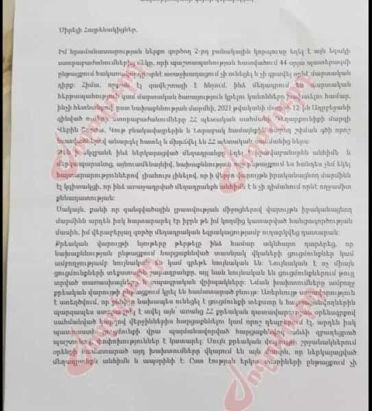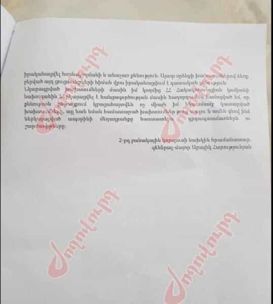 ArmLur.am-ի ձեռքի տակ է հայտնվել ՊՆ 2-րդ բանակային կորպուսի նախկին հրամանատար, գեներալ Արայիկ Հարությունյանի հայտարարություն, որը նա արել է ԱԱԾ մեկուսարանից։