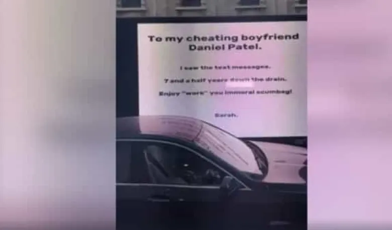 Դրա համար Սառան դիմել է մի ընկերության, որը զբաղվում է ֆուրգոնի վրա տեղադրված թվային էկրանին գովազդի տեղադրմամբ։ Նա փոքրիկ տեքստ է գրել՝ ուղղված նախկին զուգընկերոջը, որը հեռարձակվել է գովազդային վահանակի վրա։ Ֆուրգոնը տեղաշարժվել և կանգառ է կատարել քաղաքի տարբեր հատվածներում, ինչի շնորհիվ տղամարդու դավաճանության մասին իմացել են հարյուրավոր մարդիկ։ «Իմ դավաճան ընկերոջը՝ Դանիել Փեթելին։ Ես տեսել եմ հաղորդագրությունները: Յոթ ու կես տարի իզուր: Վայելիր «աշխատանքը», անբարոյական տականք։ Սառա», - գրված էր էկրանին: