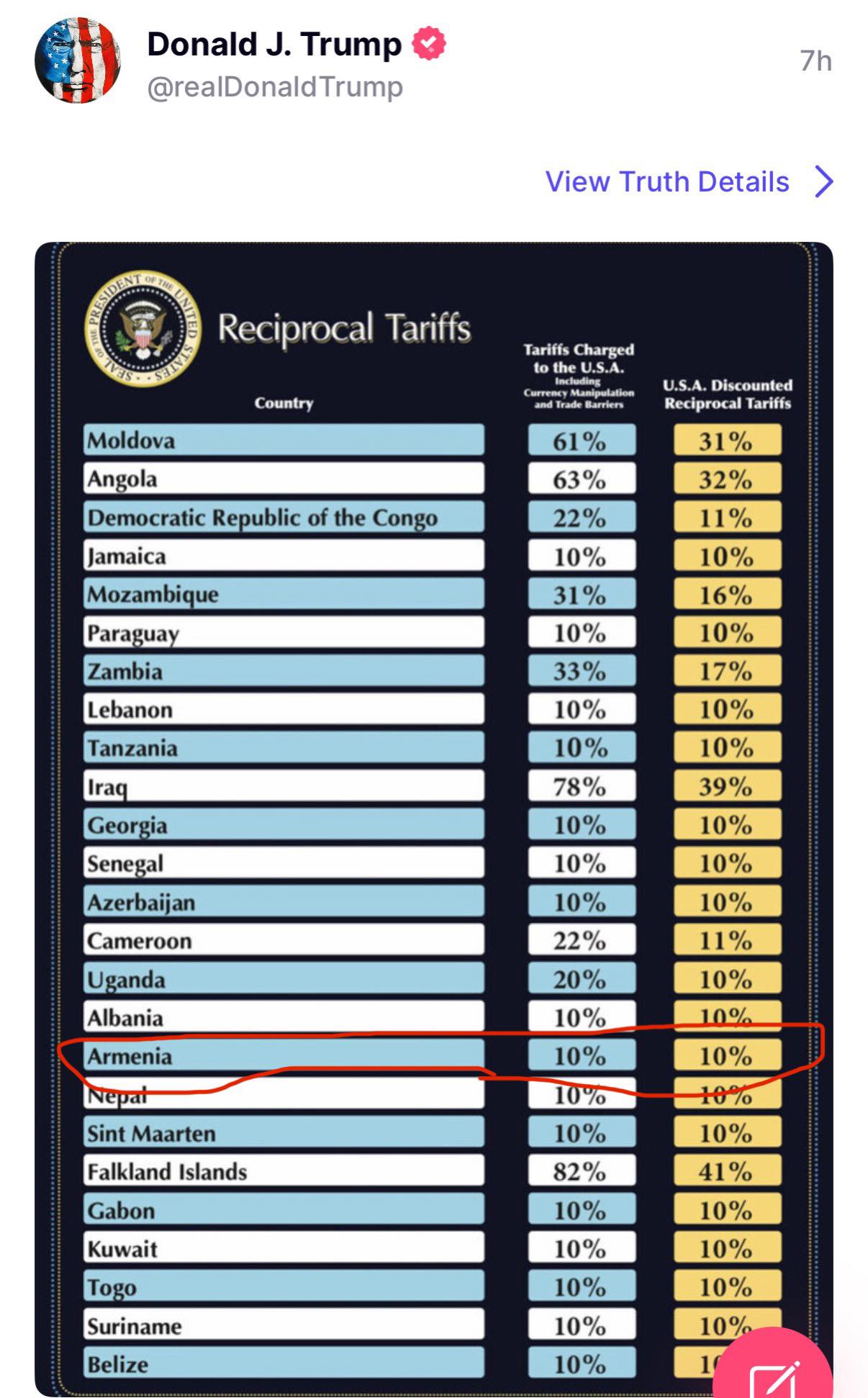 «Հայաստանը Թրամփի առևտրային պատերազմից անմասն չմնաց. գրեթե բոլոր պետություններն ընդգրկվել են նոր մաքսատուրքերի ցուցակում։ Այնուամենայնիվ, որոշ բացառություններ կան, օրինակ՝ Ռուսաստանը։ Թրամփը հայտարարել է, որ բոլոր ներմուծումների վրա 10%-անոց համընդհանուր մաքսատուրքերը ԱՄՆ-ում ուժի մեջ կմտնեն ապրիլի 5-ից։