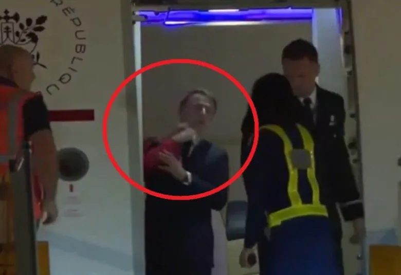 Կադրերում երևում է, որ բացվում է նախագահական ինքնաթիռի դուռը։ Այդ պահին երևում է նրա կնոջ ձեռքը, որը թեթև հարված է հասցնում նախագահին։ Նշվում է, որ տեսանյութի իսկությունը հաստատել է Ելիսեյան պալատը։