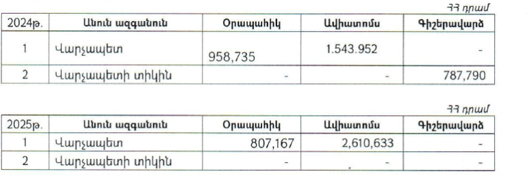 Եվ ասյպես՝ 2024թ. որպես օրապահիկ ՀՀ վարչապետ Նիկոլ Փաշինյանին հատկացվել է 958 հազար 735 դրամ, ավիատոմսի գումարը կազմել է 1 մլն 543 հազար 952 դրամ, 2024 թվականին վարչապետին գիշերավարձ չի հատկացվել: