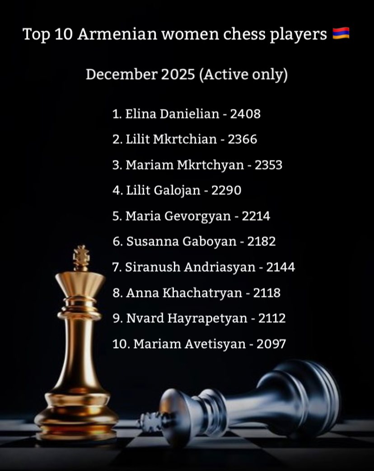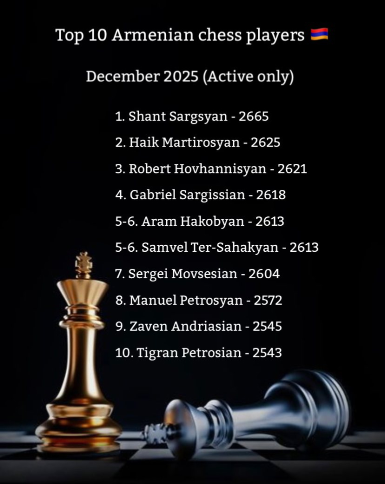 Հայաստանի շախմատի ֆեդերացիան հրապարակել է Հայաստանի 10 լավագույն շախմատիստների և շախմատիստուհիների անունները: Տվյալները ներկայացվել են 2025 թվականի դեկտեմբերի 1-ի դրությամբ: