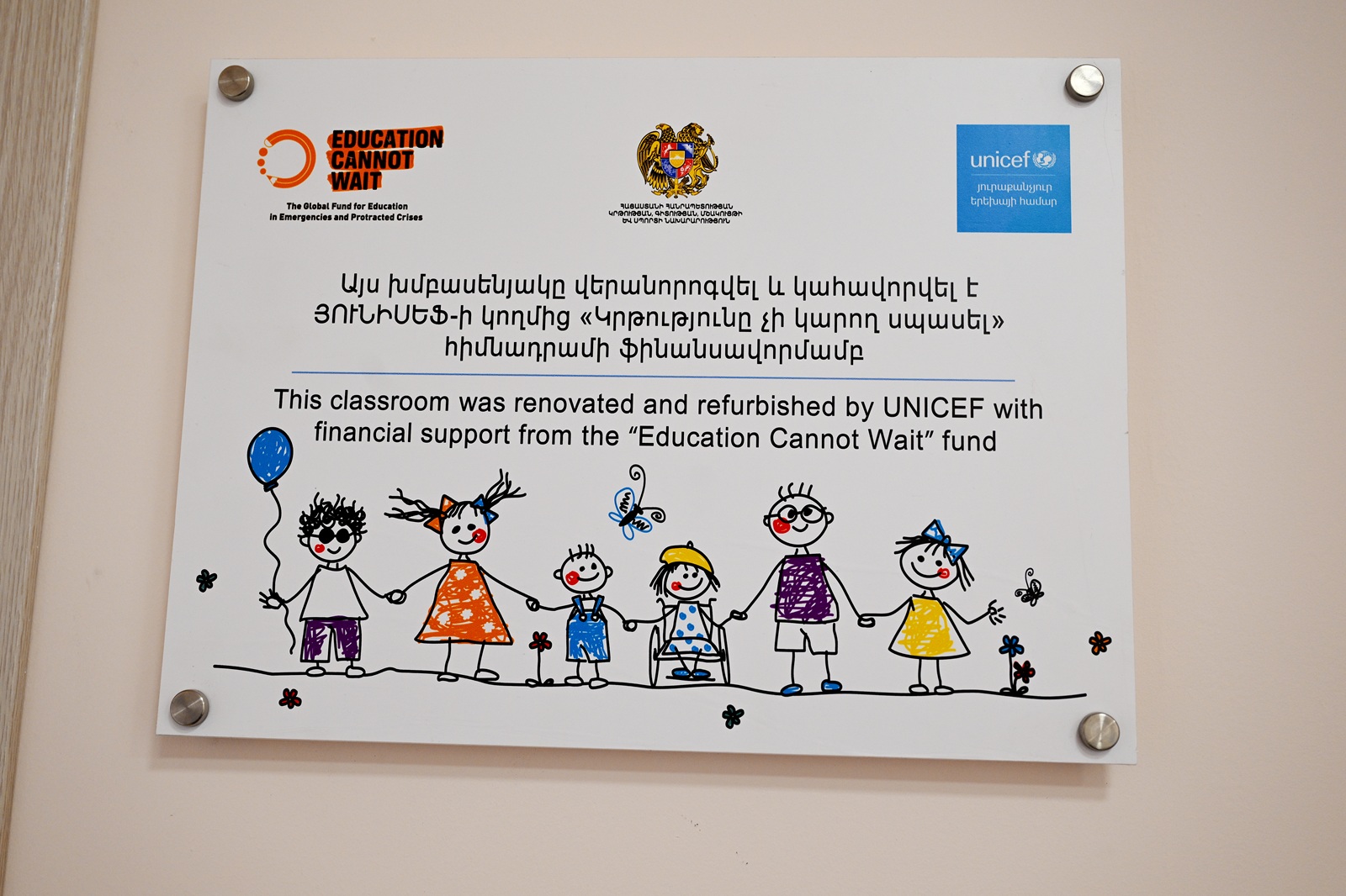 Նախադպրոցական ուսումնական հաստատություններում նոր խմբասենյակները ստեղծվել են «Կրթությունը չի կարող սպասել» հիմնադրամի աջակցությամբ՝ ՅՈՒՆԻՍԵՖ-ի կողմից իրականացվող Հայաստանում փախստականների կարիքներին արձագանքման ծրագրի շրջանակում: Ծրագիրն իրականցվել է 2023թ. հոկտեմբերից ԿԳՄՍ և ՏԿԵ նախարարությունների հետ՝ Արմավիրի, Արարատի, Կոտայքի և Վայոց ձորի մարզերում: Ծրագրի շրջանակում բացվել է 11 նոր խմբասենյակ: