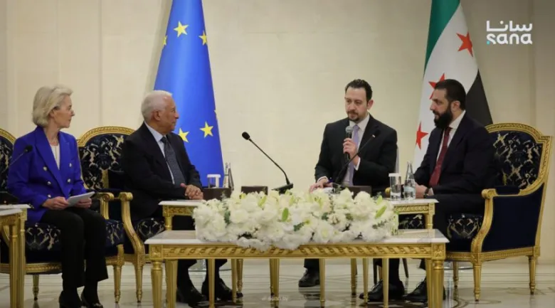 Սիրիայի նախագահ Ահմադ ալ-Շարաան ուրբաթ օրը Դամասկոսի Ժողովրդական պալատում հանդիպել է Եվրոպական խորհրդի նախագահ Անտոնիու Կոշտայի և Եվրահանձնաժողովի նախագահ Ուրսուլա ֆոն դեր Լեյենի և նրանց ուղեկցող պատվիրակության հետ, հաղորդում է SANA լրատվական գործակալությունը։