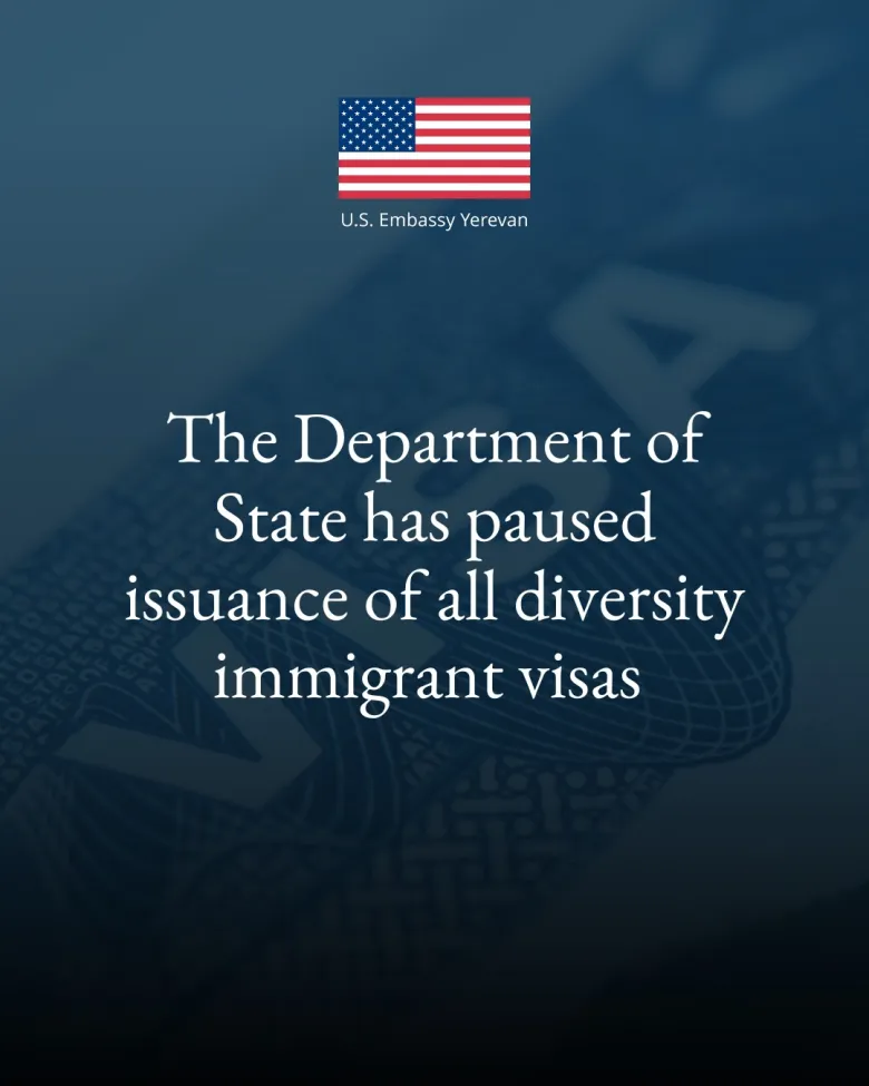 ԱՄՆ պետքարտուղարությունը կասեցրել է ներգաղթային մուտքի արտոնագրերի տրամադրումը բազմազանության արտոնագրի (գրին քարտ) խաղարկության շրջանակում։ Այս մասին ասված է ԱՄՆ դեսպանության ֆեյսբուքի էջում: