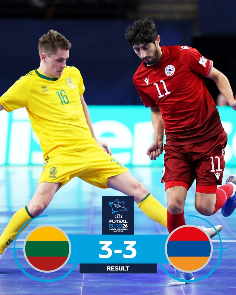 Լիտվայի Կաունաս քաղաքի «Ժալգիրիս Արենա» մարզապալատում ֆուտզալի Հայաստանի ազգային հավաքականը ԵՎՐՈ-2026-ի խմբային փուլի B խմբի վերջին՝ երրորդ տուրում ոչ-ոքի խաղաց տանտեր Լիտվայի ընտրանու հետ (3-3)։
