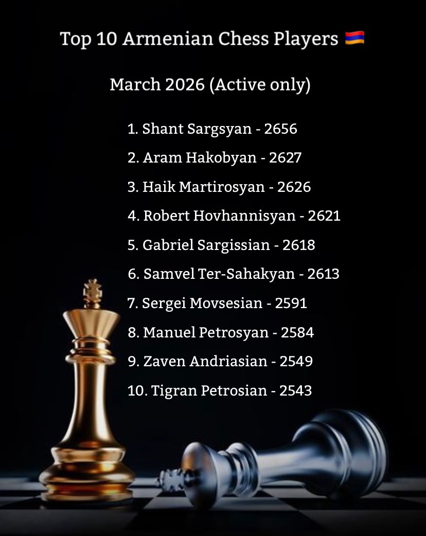 Հայաստանի շախմատի ֆեդերացիան հրապարակել է Հայաստանի 10 լավագույն շախմատիստների և շախմատիստուհիների ցանկը 2026 թվականի մարտի 1-ի դրությամբ: