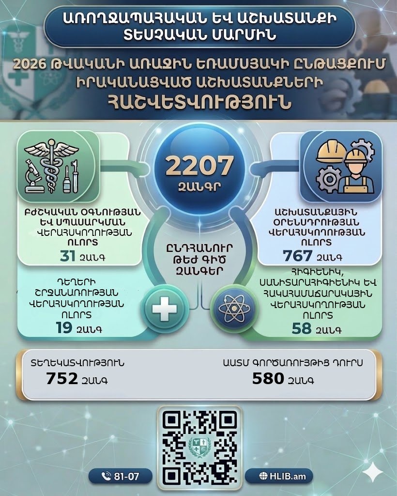 Առողջապահական և աշխատանքի տեսչական մարմինը 2026 թվականի առաջին եռամսյակում Թեժ գիծ ծառայության հեռախոսահամարով ստացված զանգերի վերաբերյալ հայտնում է.