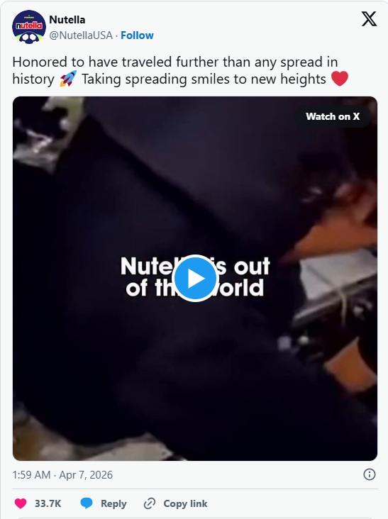 Հեռարձակումը դիտում են միլիոնավոր մարդիկ։ «Մեզ համար մեծ պատիվ է ճանապարհորդել պատմության մեջ ցանկացած կրեմից ավելի հեռու Մենք ժպիտների տարածումը նոր բարձունքի ենք հասցնում»,- գրեթե անմիջապես արձագանքել է շոկոլադե կրեմ արտադրող ընկերությունը՝ X-ում դնելով տեսագրության այդ պահը։