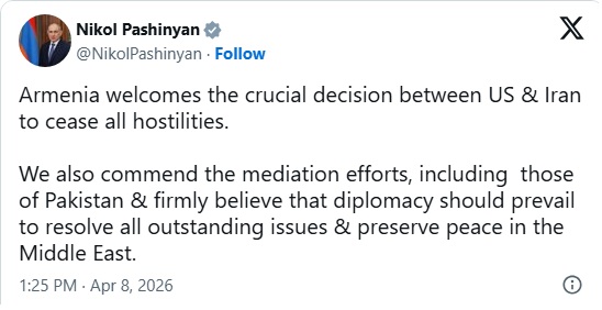 Հայաստանը ողջունում է ԱՄՆ-ի և Իրանի միջև ձեռք բերված կարևոր որոշումը՝ դադարեցնել բոլոր ռազմական գործողությունները։ Այդ մասին հայտնել է ՀՀ վարչապետ Նիկոլ Փաշինյանը՝ X-ի էջում գրառում կատարելով: