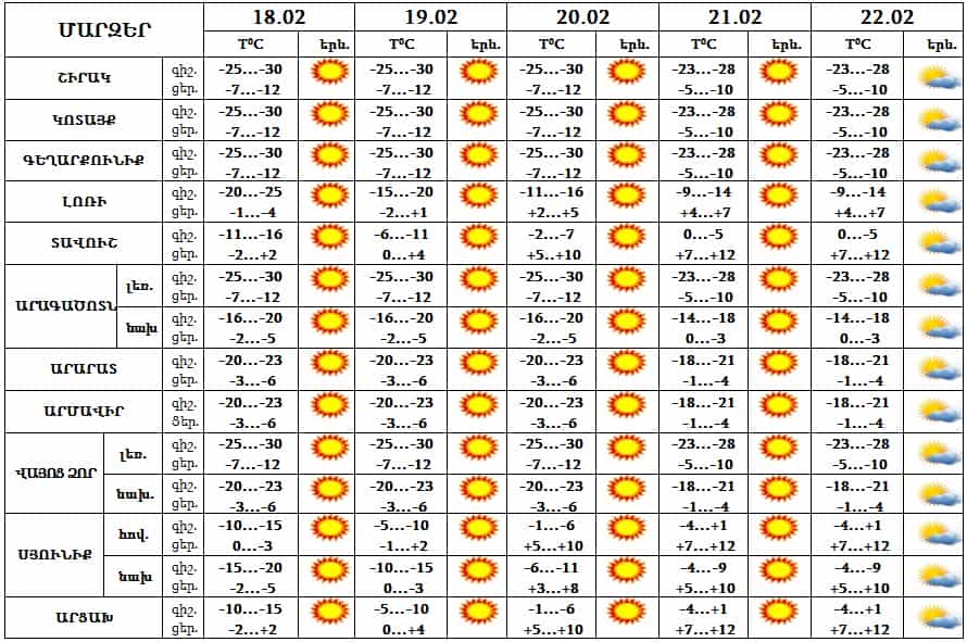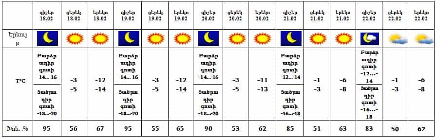 Օդի ջերմաստիճանը 18-ի գիշերը կնվազի 5-7 աստիճանով, 19-20-ը միայն Լոռիում, Տավուշում, Սյունիքում և Արցախում կբարձրանա 8-10 աստիճանով:
