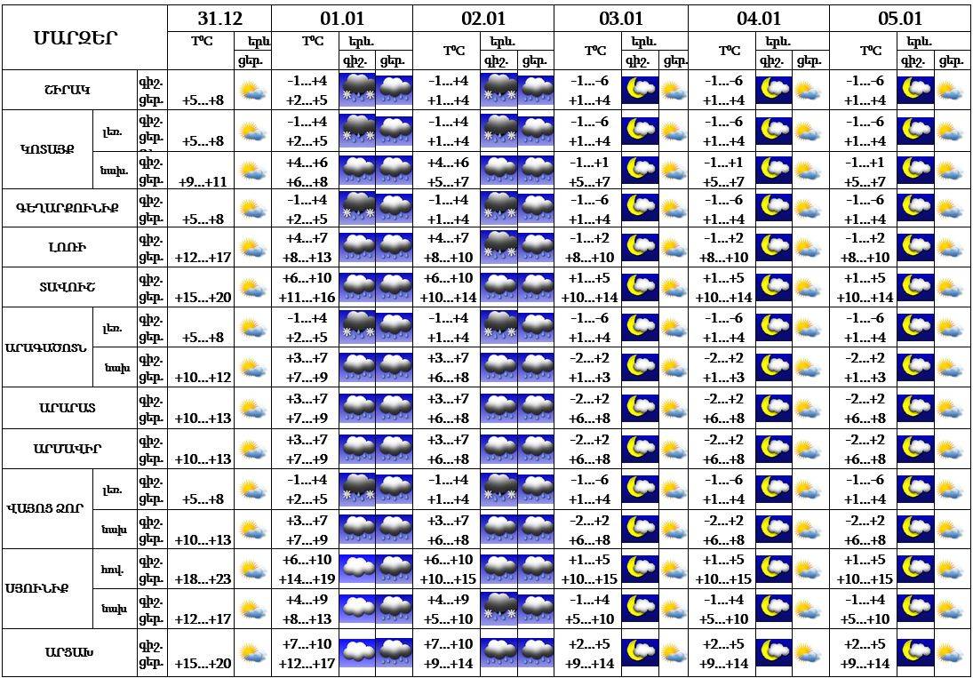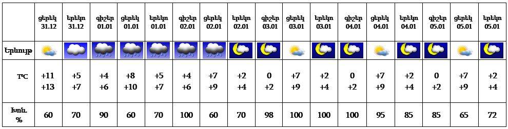 Դեկտեմբերի 31-ի ցերեկը, հունվարի 3-5-ին սպասվում է առանց տեղումների եղանակ: Հունվարի 1-2-ին ժամանակ առ ժամանակ սպասվում են տեղումներ: