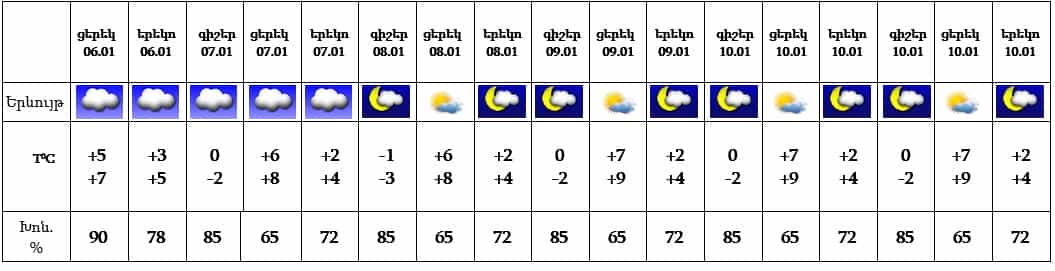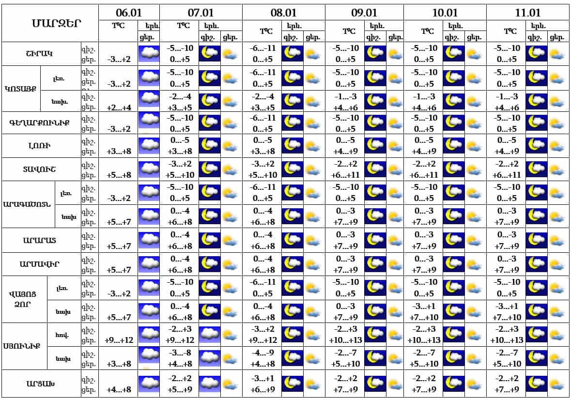 Հունվարի 6-ի ցերեկը կնկատվի ամպամածություն, էական տեղումներ չեն սպասվում, 7-11-ը սպասվում է առանց տեղումների եղանակ: