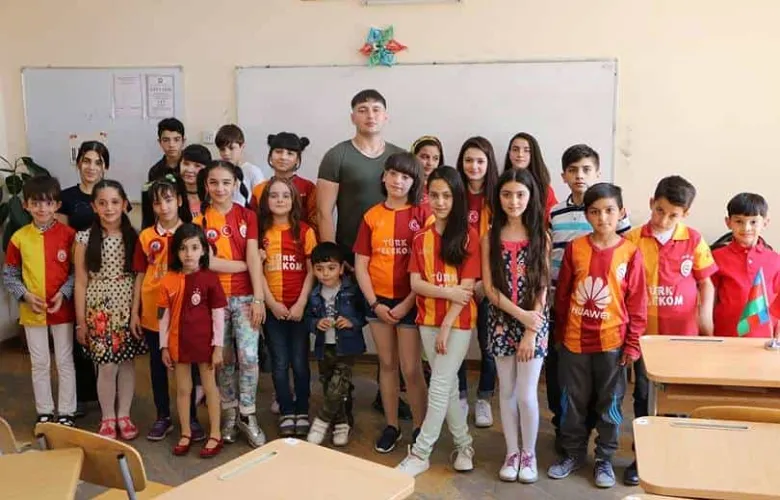 Լուսանկարի կենտրոնում Ռոշան Ազիզովն է` Բաքվի թիվ 220 դպրոցի աշակերտների հետ