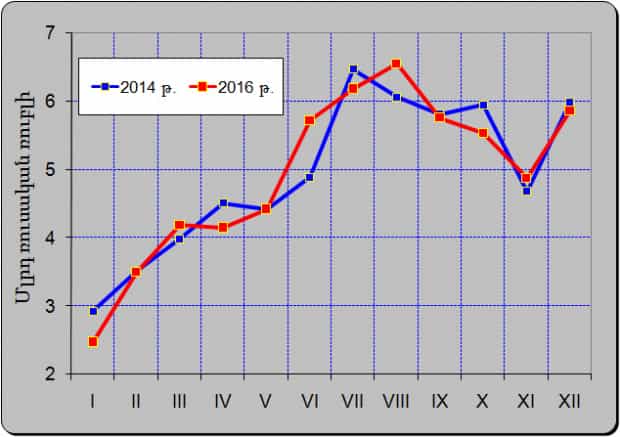 Եվ այսպես, դոլարային փոխանցումները ռուբլու վերածելիս՝ բավականին հետաքրքիր դետալ է բացահայտվում։ Պարզվում է, Ռուսաստանից 2014-ին ու 2016-ին արված դրամական փոխանցումների տարեկան գումարները համընկնում են ընդհուպ մինչեւ տասնորդական նիշի ճշգրտությամբ՝ ուղիղ 59․1 մլրդ ռուբլի (ամիսների կտրվածքով տե՛ս երկրորդ գրաֆիկը)։ Հաշվարկը կատարվել է Ռուսաստանում ԱՄՆ դոլարի միջին անվանական փոխարժեքով, տարվա յուրաքանչյուր ամսվա համար։ Հասկանալի է, որ իրական ցուցանիշը կարող է տարբերվել հաշվարկայինից։ Բայց կարեւոր է այն, որ փոխանցումների սկզբնական գումարը (այսինքն ռուբլով) երկու տարում գրեթե անփոփոխ է մնացել։