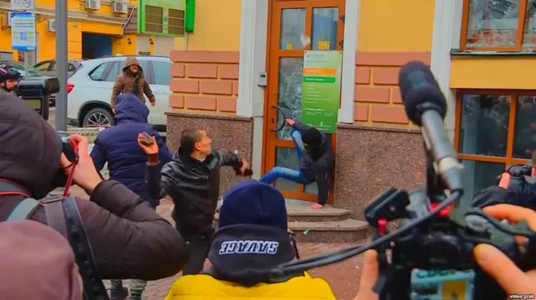 Կիևում ժամեր առաջ ավարտված բողոքի ակցիայի մասնակիցներից ոմանք՝ ուկրաինացի ազգայնականները, կոտրել են ռուսաստանյան տարբեր ընկերությունների հետ առնչություններ ունեցող երեք շենքերի ապակիներ: