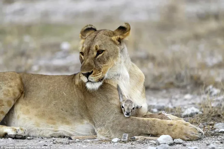Նամիբիայում իր ձագերից զրկված առյուծը «որդեգրել է» այծքաղի ձագին (լուսանկարներ)