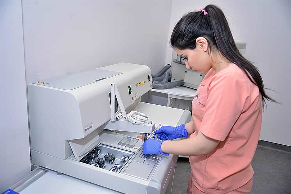 -Հիստոջեն պաթոլոգիայի հայ-գերմանական գիտական կենտրոնը հագեցված է վերջին սերնդի ժամանակակից բոլոր սարքավորումներով՝ ձևաբանական հետազոտությունների բոլոր փուլերը լիարժեք և որակյալ կատարելու համար, ընդհուպ մինչև ավտոմատիզացված իմունոհիստոքիմիական հետազոտությունների համակարգը: Իրականացնում ենք ավտոմատիզացված իմունոհիստոքիմիական հետազոտություններ ճշգրիտ արդյունքներով, թիմային հստակ կանոնակարգված աշխատանքով յուրաքանչյուր փուլում՝ որակի ապահովման համար: