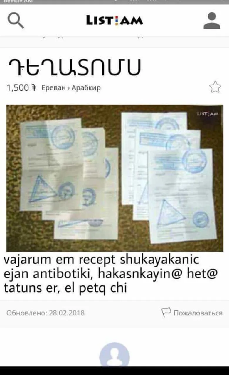 Հայտարարությունների կայքում զավեշտալի ու միևնույն ժամանակ աբսուրդ հայտարարություն է տեղադրվել, որում մասնավորապես ասվում է. «Վաճառում եմ ռեցեպտ շուկայականից էժան. անտիբիոտիկի, հակասնկայինը հետո. տատունս էր, էլ պետք չի»: