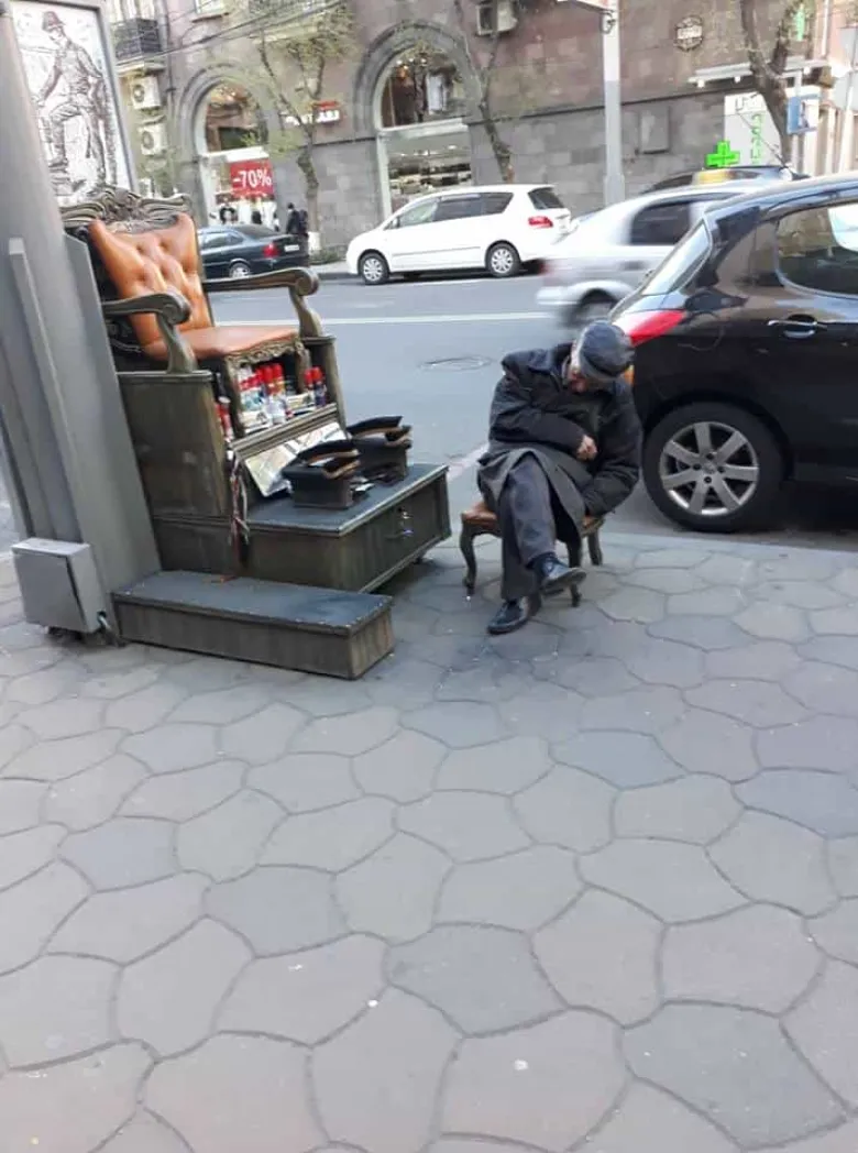 Գործն է շատ հոգնել է, թե՞ գործ չկա ձանձրացել է: Այսպես թե այնպես Հայաստանում միակ կոշիկ մաքրող ծերուկը քնել էր աշխատանքի ամենաթեժ ժամին: