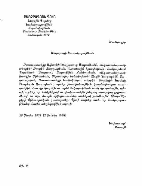Թալեաթի հեռագիրը Անկարայի նահանգապետին` հայ մտավորականներին Դիարբեքիրի ռազմական դատարան հանձնելու մասին