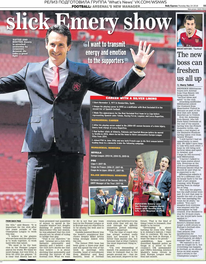 Անգլիական Daily Express օրաթերթի լրագրող Հարի Տալբոթն զրուցել է Հայաստանի հավաքականի ավագ Հենրիխ Մխիթարյանի հետ՝ հետքրքրվելով, թե ինչ կարծիք ունի իսպանացի մասնագետ Ունայ Էմերիին Լոնդոնի «Արսենալի» նոր գլխավոր մարզիչ նշանակելու մասին:
