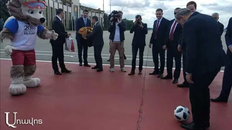Փաշինյանը օդանավակայանում ֆուտբոլ է խաղացել Աշխարհի գավաթի խորհրդանիշ «Զաբիվակա» գայլի հետ: