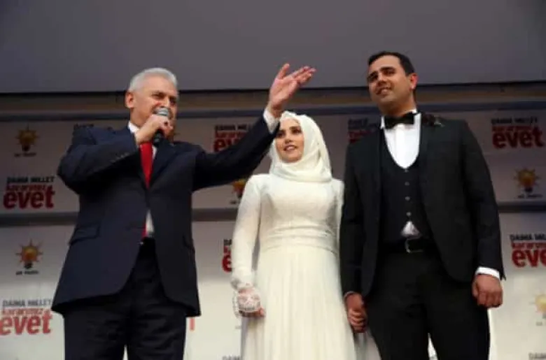 Թուրքիայի վարչապետ Բինալի Յըլդըրըմը Թոքատ նահանգում տեղի ունեցած նախընտրական հանրահավաքի ընթացքում հենց բեմի վրա մասնակցել է պսակադրության արարողության: