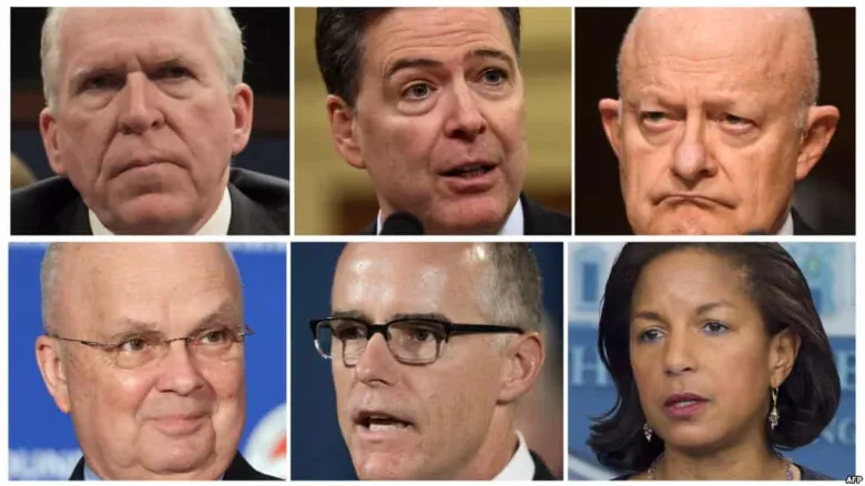 Այդ ցանկում են Կենտրոնական հետախուզական վարչության նախկին տնօրեն Ջոն Բրենանը, Թրամփի որոշմամբ անցյալ տարի պաշտոնանկ արված Հետաքննությունների դաշնային բյուրոյի տնօրեն Ջեյմս Քոմին, Ազգային հետախուզության նախկին տնօրեն Ջեյմս Քլափերը, Ազգային անվտանգության գործակալության նախկին տնօրեն Մայքլ Հայդենը, ազգային անվտանգության հարցերով նախկին խորհրդական Սյուզան Ռայսը և Հետաքննությունների դաշնային բյուրոյի նախկին փոխտնօրեն Էնդրյու ՄըքՔեյբը: